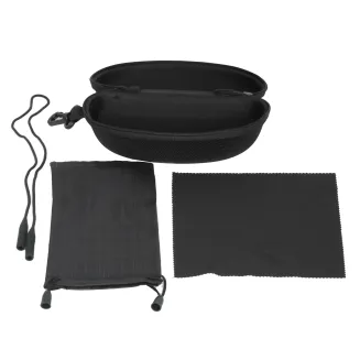 Okulary, twarde etui oraz fibra do czyszczenia szkieł.
