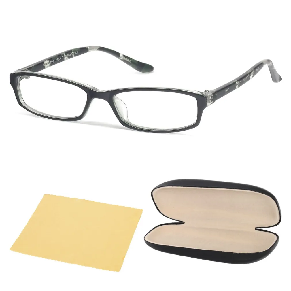 Okulary, etui oraz fibra do czyszczenia szkieł.