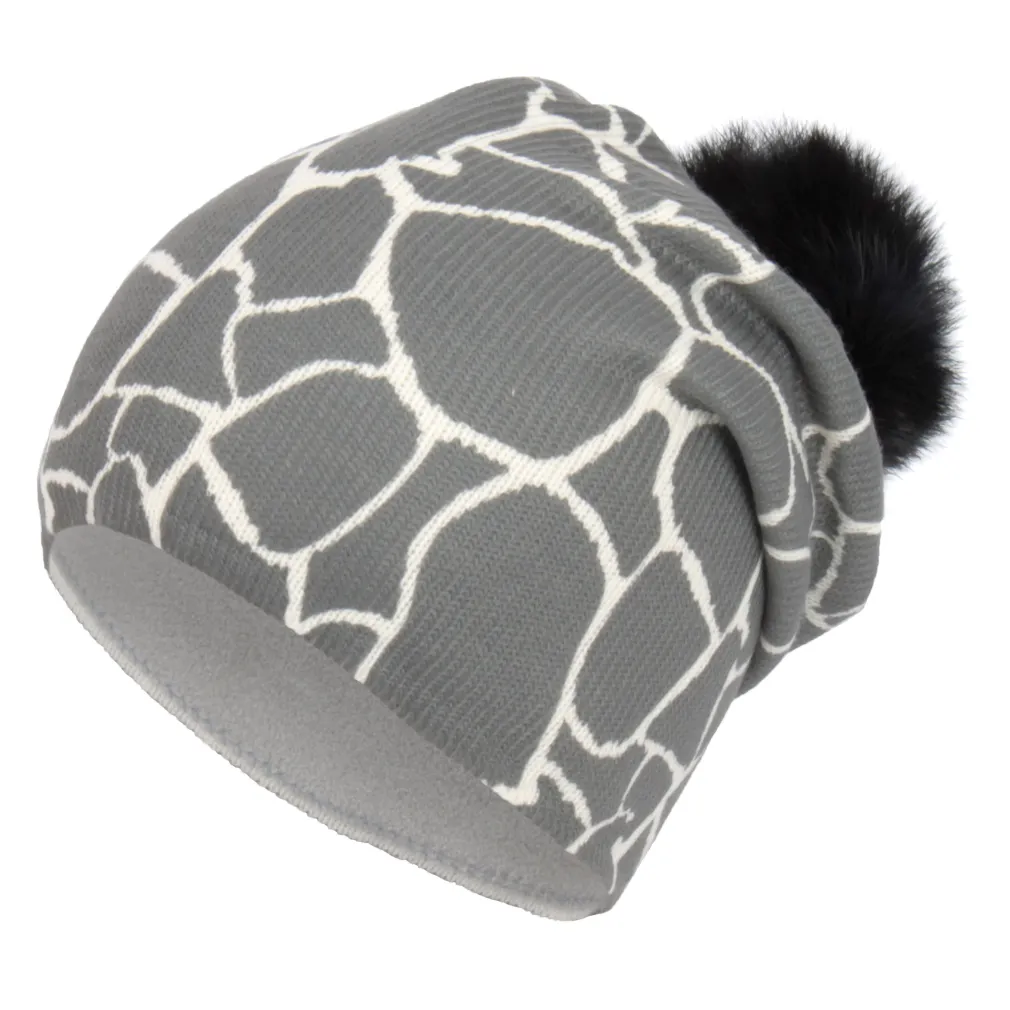Damska zimowa czapka dzianinowa Model: W-256E to elegancki i funkcjonalny dodatek do Twojej zimowej garderoby. Ta szara czapka typu beanie posiada ozdobny wzór imitujący cętki żyrafy, co nadaje jej oryginalny i modny wygląd.