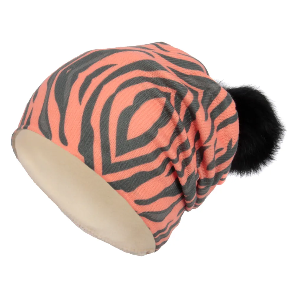 • W258C Orange A Warm Winter Hat Zebra With Fleece Pompon With Rabbit Fur