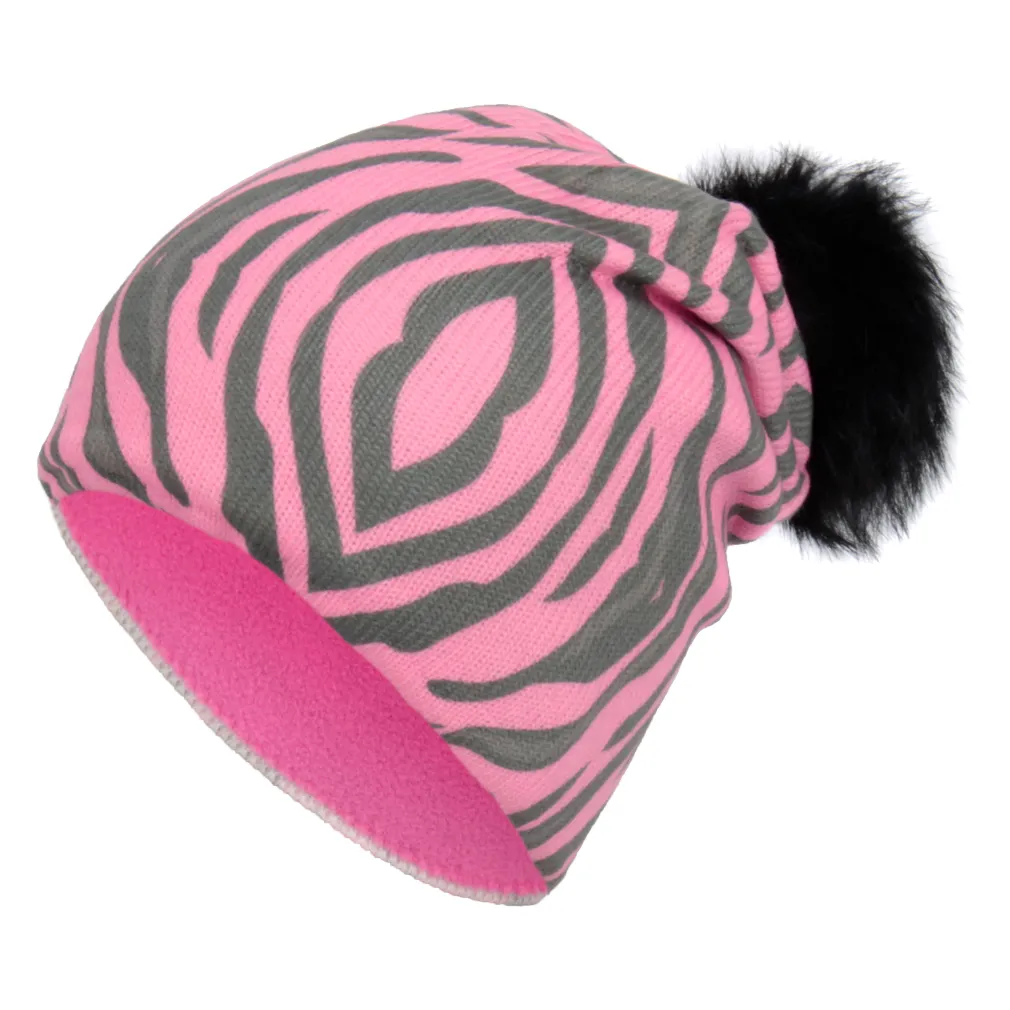 • W258D Pink A Warm Winter Hat Zebra With Fleece Pompon With Rabbit Fur