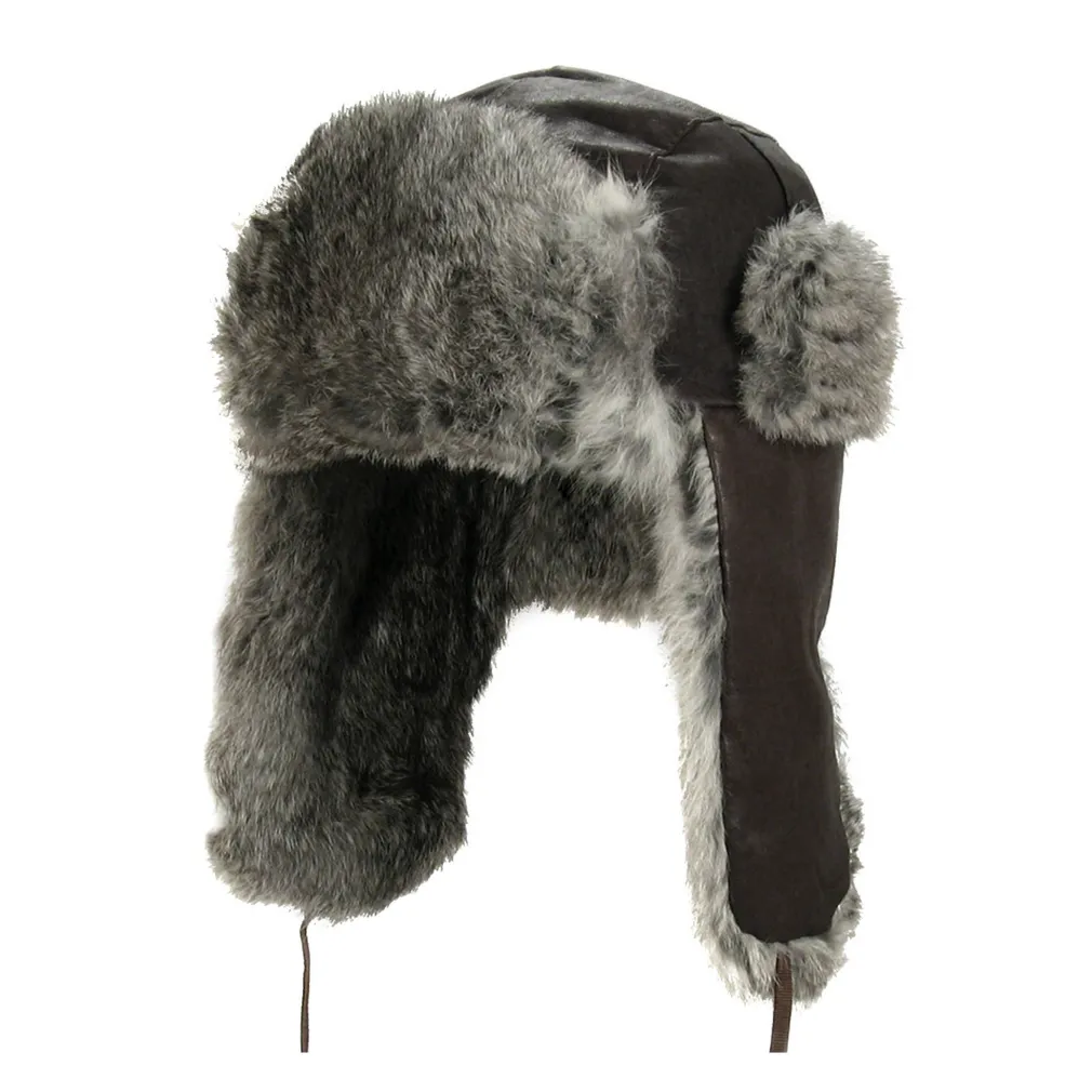 W43D Brown- Grey Warm Winter Leather Eared Hat Insulated With Natural Rabbit Fur