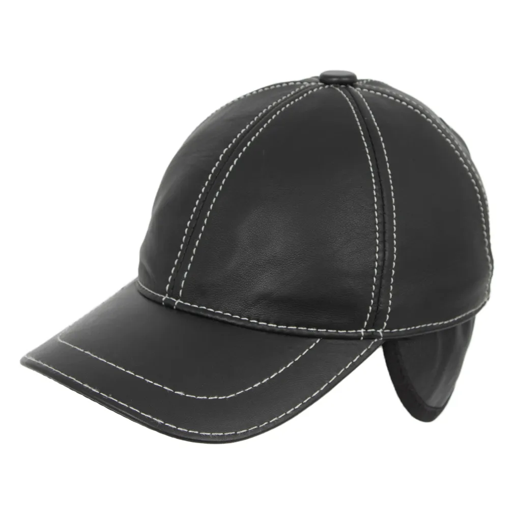 K231D Czarna Skórzana czapka bejsbolówka ocieplona z nausznikami regulacja