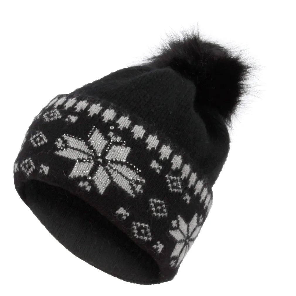 W331C Czarna Polar Fashion ciepła czapka zimowa wywijana beanie oryginalny design motyw śnieżki pompon