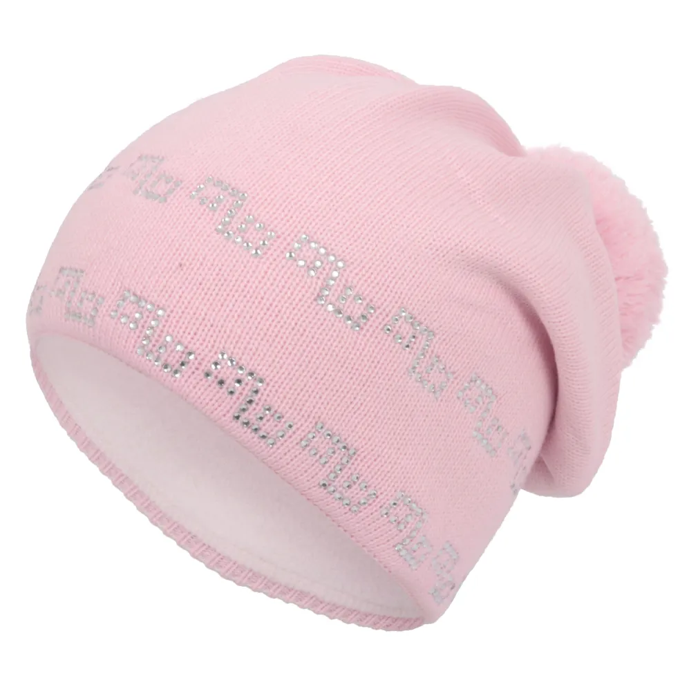 W255C Różowa Damska czapka zimowa z dżetami ciepła na polarze