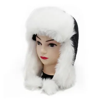 W161D Czarno-biała Czapka zimowa uszatka ortalion ocieplana futerkiem